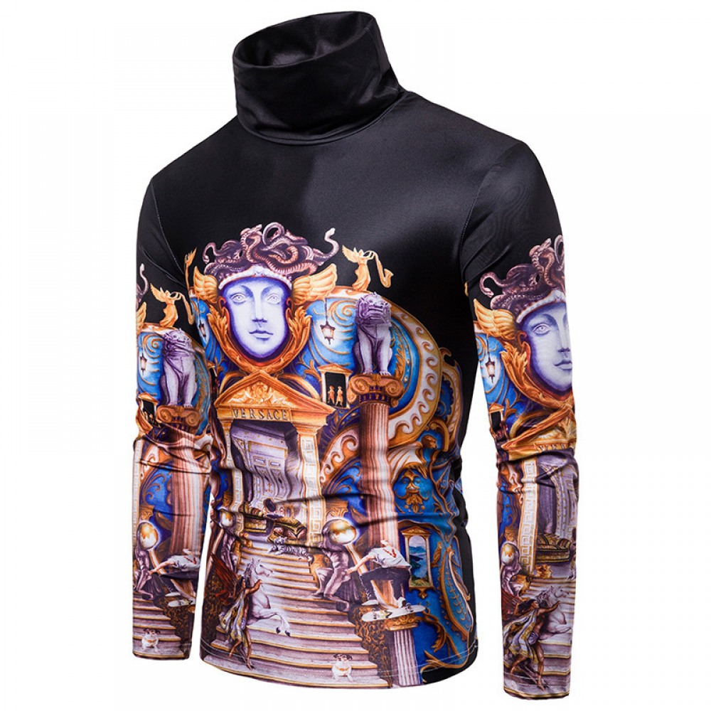 New Men's Large Size 3D Retro Castle Print High Neck Long Sleeve T-Shirt Bottoming Shirt