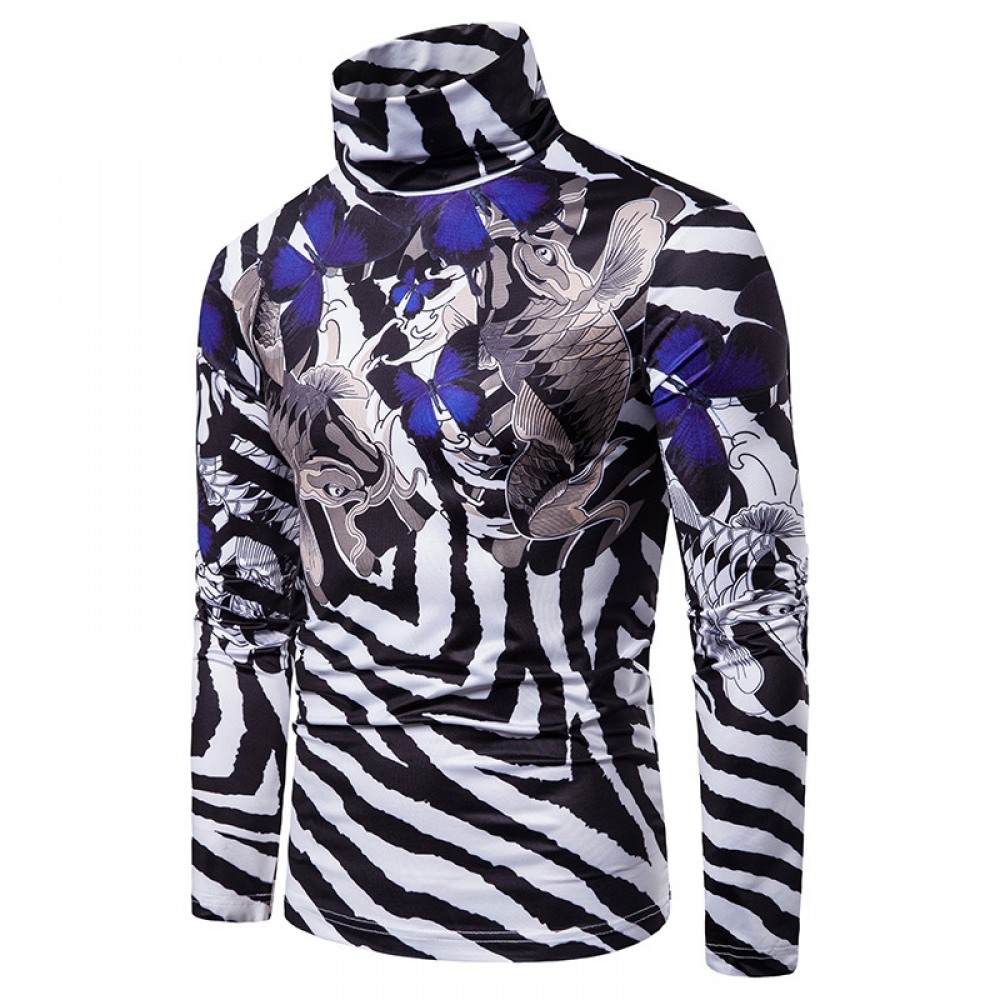 New Men's Large Size 3D Striped Carp Print High Neck Long Sleeve T-Shirt Bottoming Shirt
